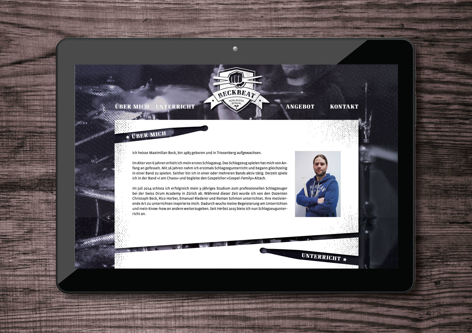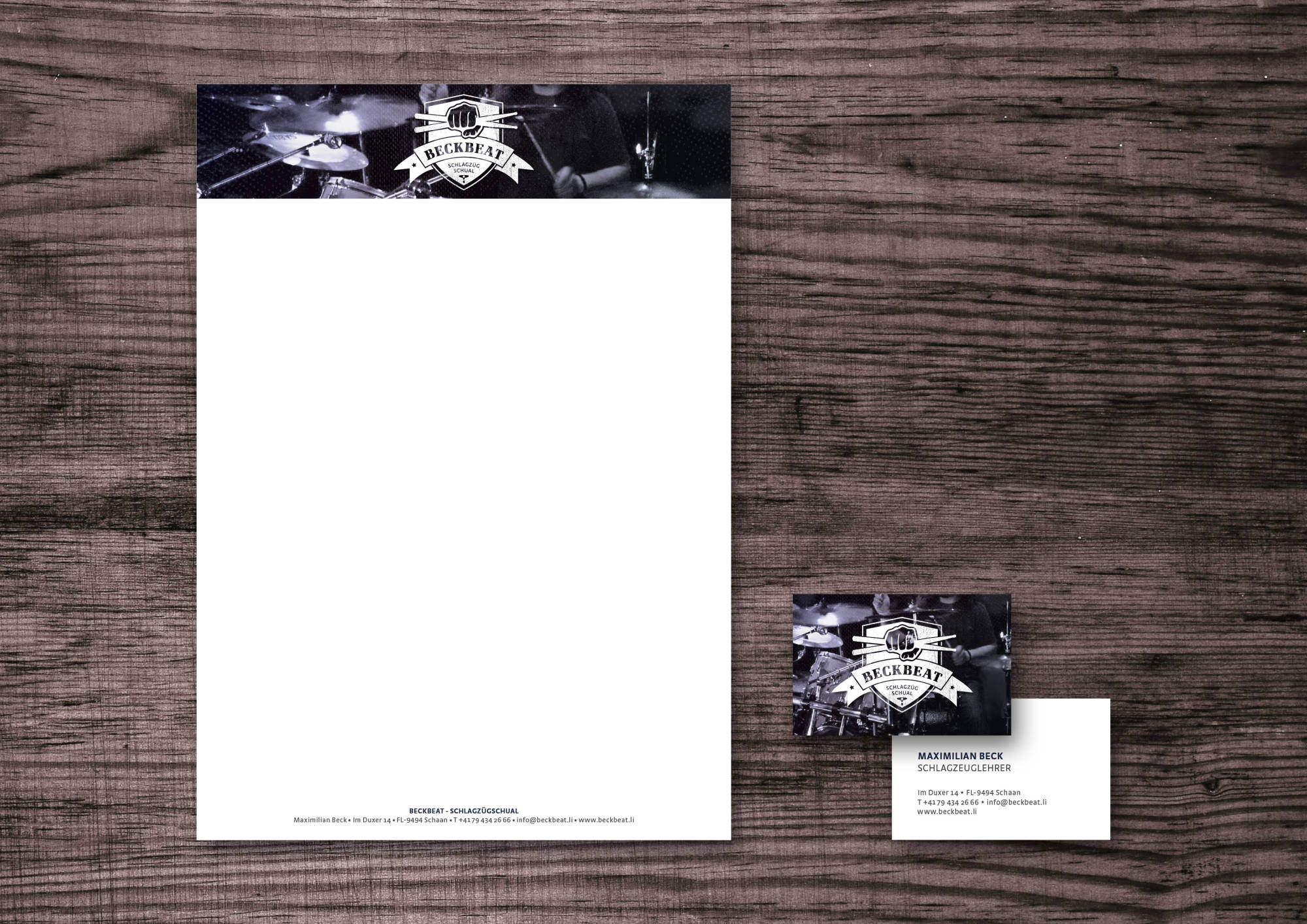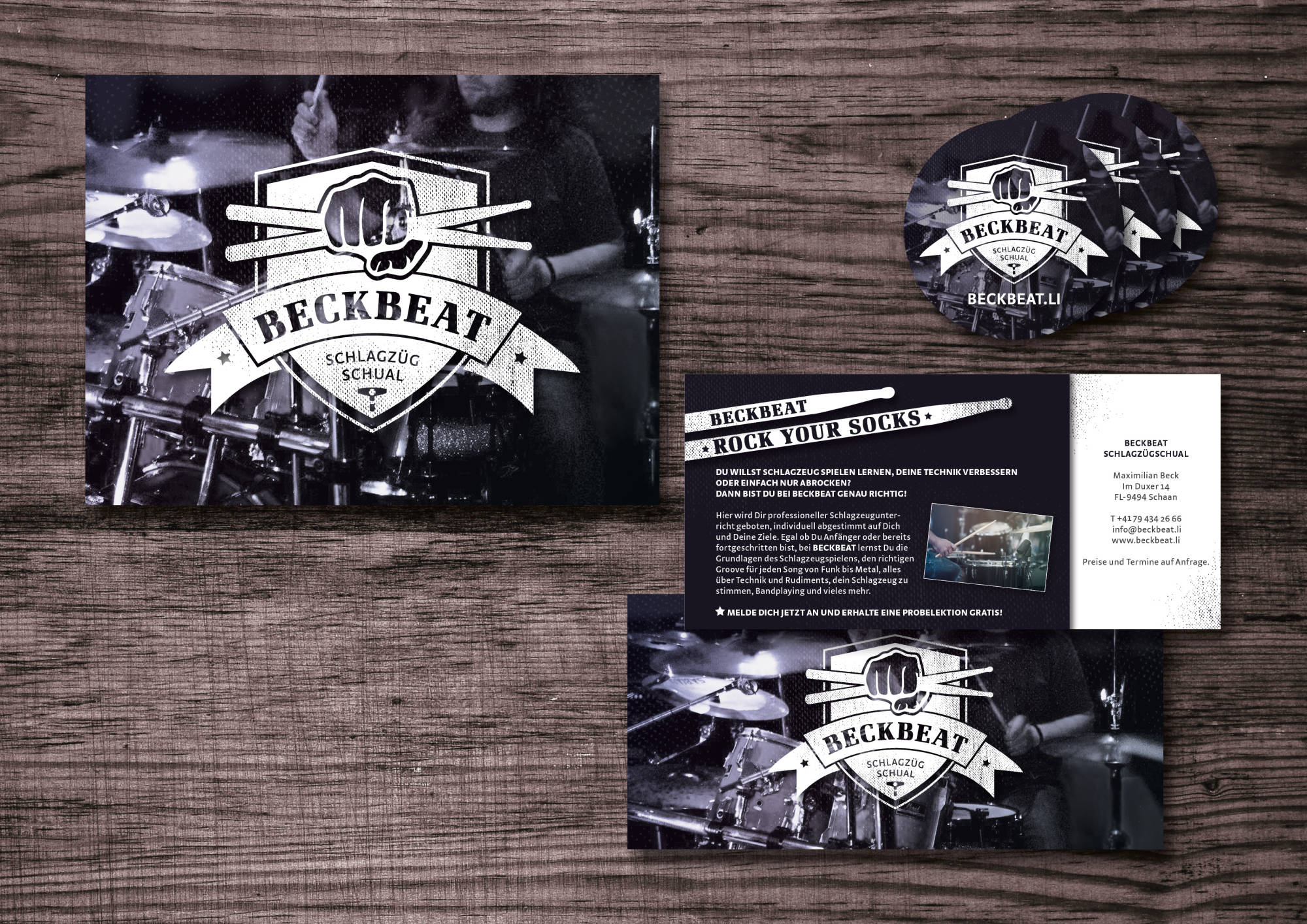 Corporate Design, Webdesign, Fotografie. Maximilian Beck bietet professionellen Schlagzeugunterricht an, individuell abgestimmt auf den jeweiligen Schüler. Für seine "Schlagzügschual" wurde das gesamte Corporate Design entworfen: Logodesign, Briefsorten, Aussenschild, Autobeschriftung, Sticker und Webseite.